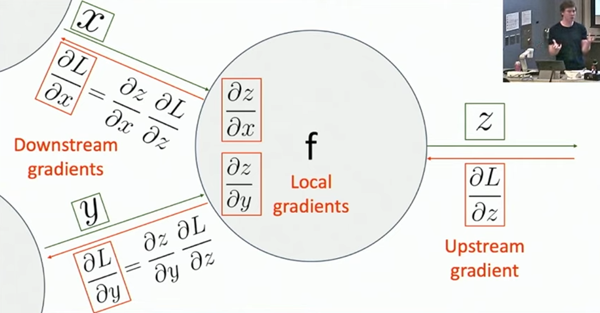 的节点都对应了一个运算数,而其余的节点对应了某种运算。不同之处在于 Computational Graph 是一张 DAG(有向无环图),即每一个节点可以向多个后继节点贡献。容易看出,表达式的运算在 Computational Graph 上是按照拓扑序进行的。我们将这一按照拓扑序进行运算得到结果的过程称作 Forward Pass 。现在我们再考虑如何从 Computational Graph 上得到所有参数的偏导数。我们将代表运算符的节点视作中间变量,假设我们已经求得了中间变量 的偏导数(称作 upstream gradient),并希望推知 的前驱节点 与 的偏导数(称作 downstream gradient),如下图所示: