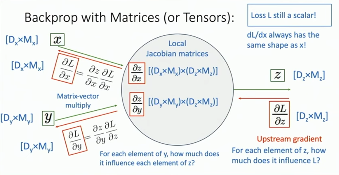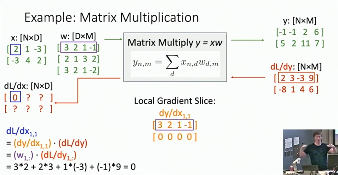 特别的,有时 Computation Graph 上的计算会涉及到张量2。这时一个相对好的处理方式是,跟踪后继中的单一变量的梯度,最后将其整合为一体,统一计算。而一个比较取巧的思路是,反正我们知道 updtream 、downstream 和 local 的所有张量的形状,所以我们只需要想办法把这些形状凑出来(例如通过矩阵乘法),再检验即可。