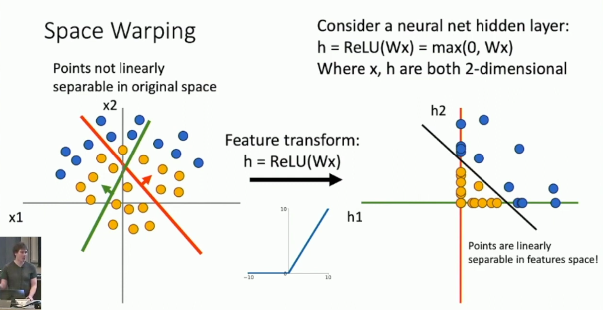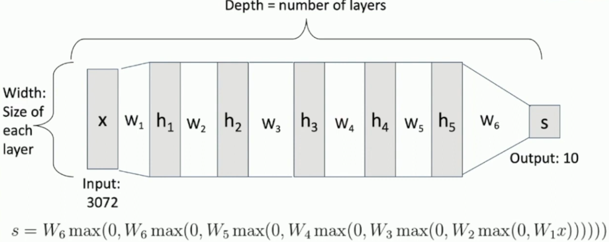 我们期待多层神经网络的表达能力要强于一般的 Linear Classifier 。不妨考虑神经网络的几何意义。先考虑单层神经网络,其实际上仍然是用了若干个超平面来划分类别。这几个超平面应该应该把整个空间划分为了若干块,然后通过 ReLU 函数,我们把所有点都集中到了其中的一块上。最后,我们在这一块空间上进行下一层神经网络的划分。因此,可以看出,由于激活函数的作用,深层神经网络的超平面对应到浅层的空间就不再是线性的了。浅层神经网络通过线性划分而扭曲了空间,从而增强了深层网络的表达能力。