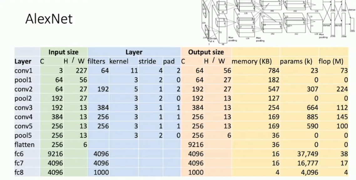 衡量模型表现的重要因素,除开准确率之外,还有内存占用(memory)、参数量(params)以及浮点运算量(flop)。按照上篇中我们谈过的 CNN 的结构,这些指标都不难计算。下表给出了 AlexNet 的详细指标: