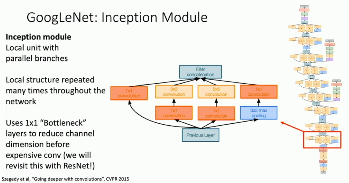 不同于 VGG Net ,Google Net 采用了复用网络模块的思路,即通过构造一个通用模块,再不断堆叠来搭建网络。Google Net 在网络模块中引入了平行分支,通过在不同的分支中同时做不同尺寸的卷积来避免引入卷积尺寸这一超参数。而为了控制卷积层的时间开销,Google Net 选择在卷积层之前加入 1*1 卷积层(称作 bottlenecks)来缩减 channel 的数目。