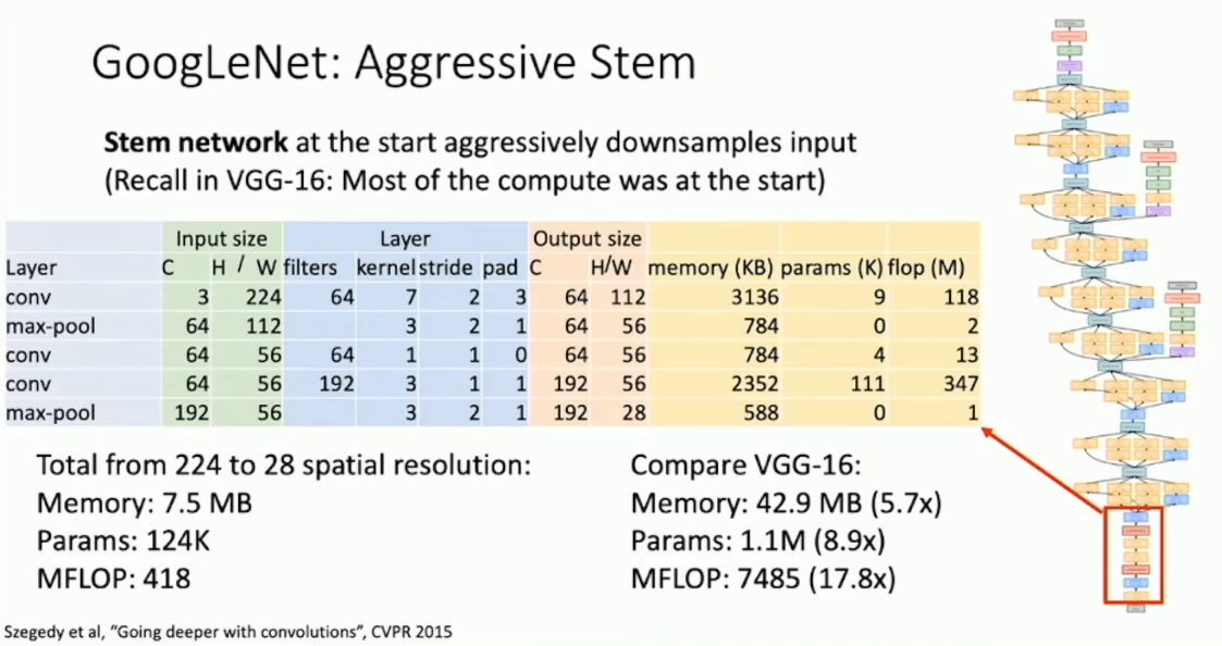 2014 年脱颖而出的另一模型则是 Google Net 。Google Net 与 VGG Net 有很多共同点,但特别之处是 Google Net 把重心放到了控制模型的算力开销上。Google Net 在模型的最初几层采取了激进的 down sample 策略以减少后续计算量。