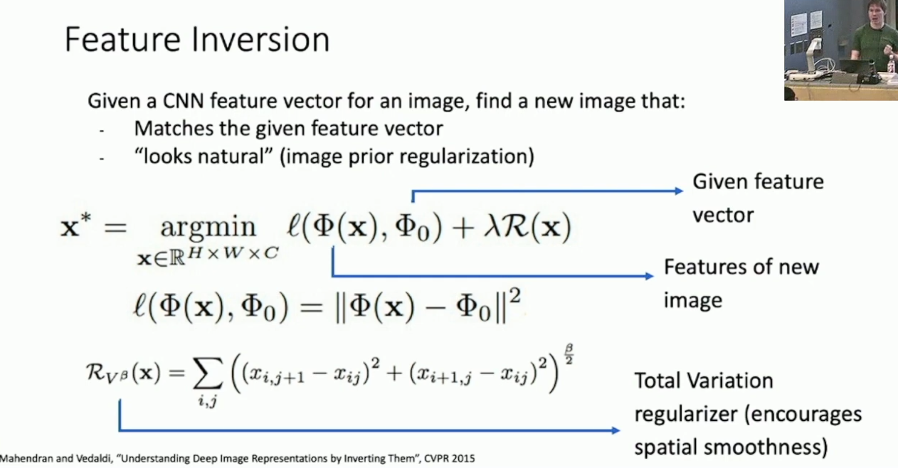 范数。值得一提的是,通过某些精心设计的正则化,我们可以生成出看起来很不错的图片。 另一方面,优化对象也可以是 feature map 或者 feature vector 之类的,这种思路称作 feature inversion 。简单的说,我们希望可以找到一个图像最好的匹配了给定的 feature vector ,当然也需要带上某种正则化。度量匹配程度的方式一般是