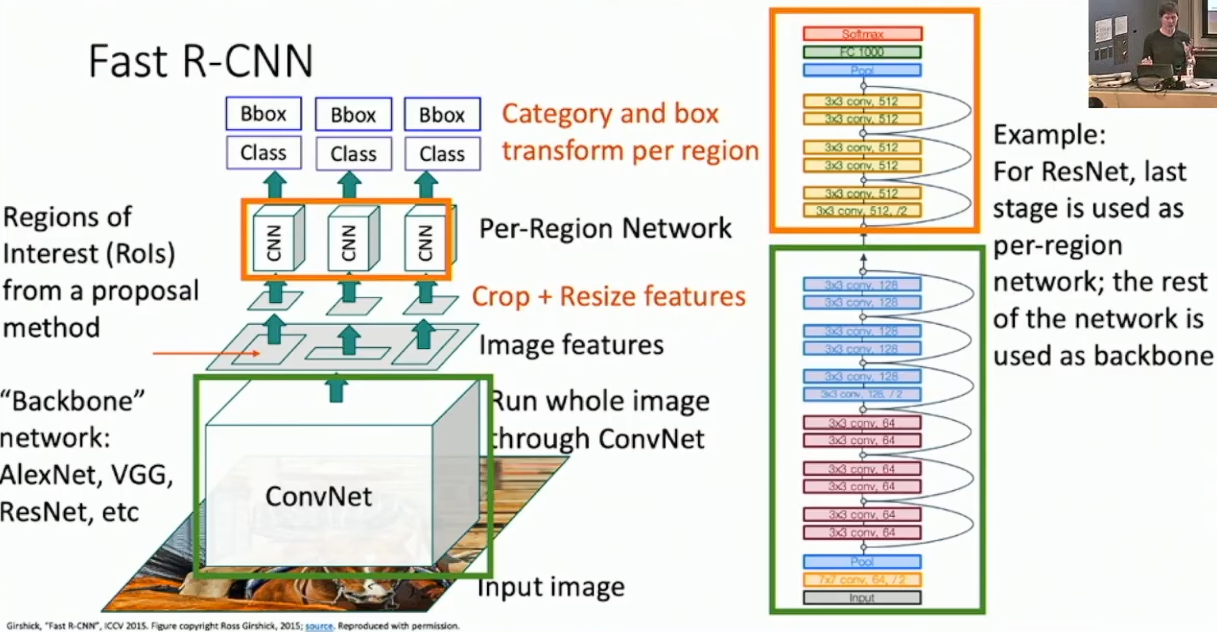 先前的 R-CNN 太慢了,难以在终端中实时运行。而其时间复杂度的主要来自多次运行完整的 CNN ,因此我们考虑将 CNN 的运行进行合并。具体的,我们先让原图通过一个较大的 CNN(称作 Backbone Network)以进行特征提取,然后对于每一个 Region Proposal 得到的切片,我们将其投射到 Backbone Network 最后得到的 feature map 上,然后对投影8进行剪切,再将其分别输入另一个较小的网络(称作 Per-Region Network)以进行最后的预测。