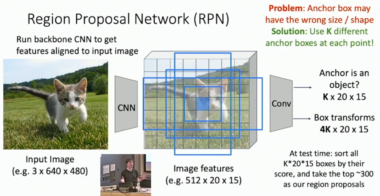 Fast R-CNN 已经显著的快于 R-CNN 了,现在的时间复杂度瓶颈在于 CPU 上运行的 Selective Search 。我们考虑同样使用神经网络来执行 Region Proposal 。具体的,我们考虑在 Backbone Network 得到的 feature map 上加入一个较小的神经网络,称作 Region Proposal Network 。对于 feature map 的每一个位置,我们在此处嵌入若干个不同大小的 anchor box 9,并使用 RPN 做 3 分类,以预测每一个 anchor box 是好的、坏的、或者中性的,并预测非中性物件的位置参数。