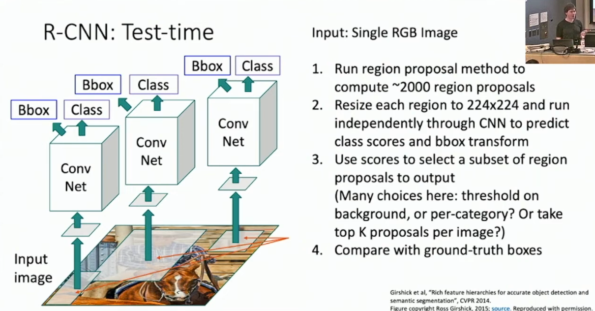 现在我们考虑如何设计训练 R-CNN 时的损失函数,这一点其实是类似于 Image Classification 的。具体的,对于 Region Preoposal 得到的切片,我们计算其与所有 groud truth box 的 IoU ,并令切片对应其中的最高者。若该 IoU 高于某一阈值,我们就认为该切片是好的;反过来,若 IoU 低于另一阈值,该切片就是坏的。3接下来,我们添加一类背景标签,用于描述坏切片。我们希望训练 CNN ,使其可以将所有好切片辨认为对应的 groud truth box ,并且将所有的坏切片辨认为背景。而具体的损失函数就设计为标签分类的 softmax loss ,再加上预测好切片的位置参数时的回归损失4。