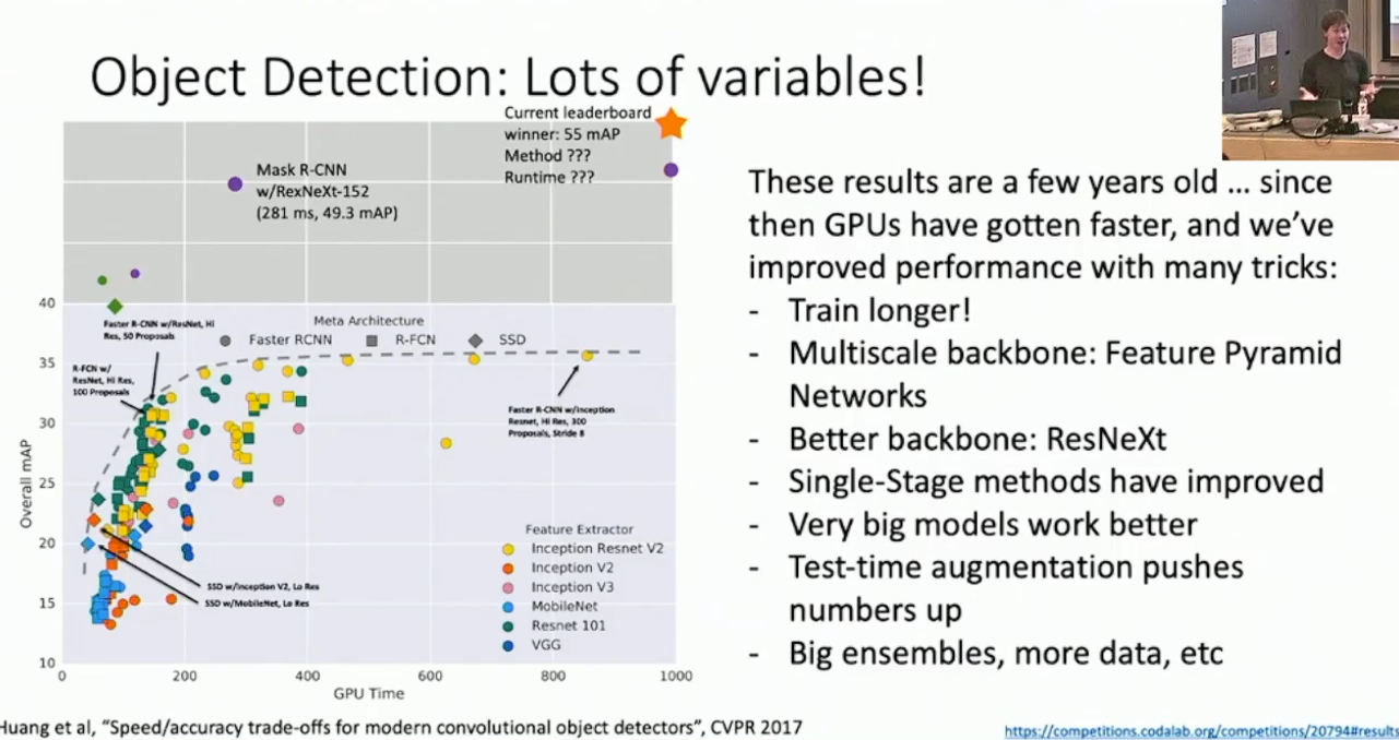 截止 2019 年,Object Detection 似乎还在迅速发展。我们在这里无意详述模型之间的性能比较,你可以通过下面这张图直观的感受到: