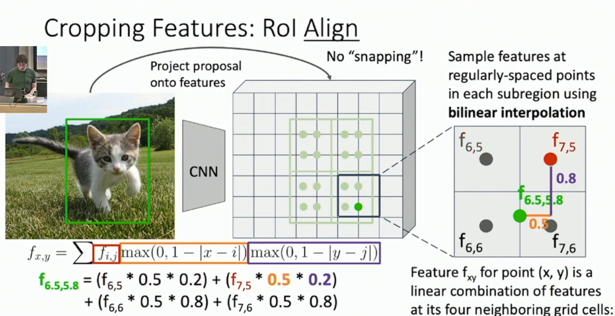上述算法主要的问题是,我们要如何将原先的切片投射到 feature map 上,因为这些切片不一定可以对齐 feature map 的网格。一个简单的方式,被称作 Region of Interest Pool ,大概是强行进行切片到 feature map 的对齐,然后按照 PRN 的输入大小对投影进行尽量均匀的切分,再对每一块做 max pool 。另一个更好的方式被称作 RoI Align ,过程是先按照 PRN 的输入大小对切片进行均匀的切分,然后对于每一块,我们选定一些采样点。这些点的坐标不一定是整数,即不一定可以对齐 feature map ,所以我们需要采取名为 bilinear inperpolation 的方式,即选定距离该采样点最近的四个 feature vector ,按照距离加权计算它们的均值,作为该点的采样。最后我们再对于每一块做 max pool ,以得到 PRN 的输入。示例如下: