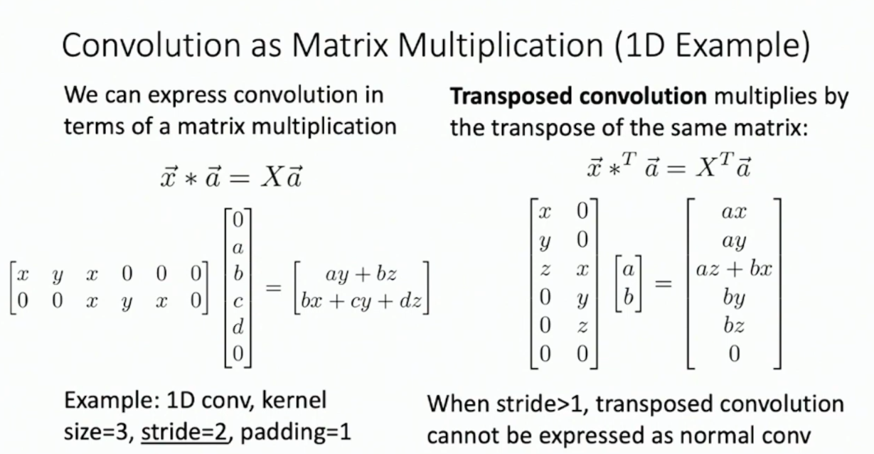 Transposed Convolution. 通过设定 stride 大小,卷积是可以做下采样的。不妨考虑卷积能不能做上采样——严格的说,不行,但是有类似的技术可以做到,这就是 Transposed Convolution 。Transposed Convolution 基本是把 Convolution 按原先的方式反着做了一遍。至于为什么叫 Transposed ,考虑以下的一维形式: