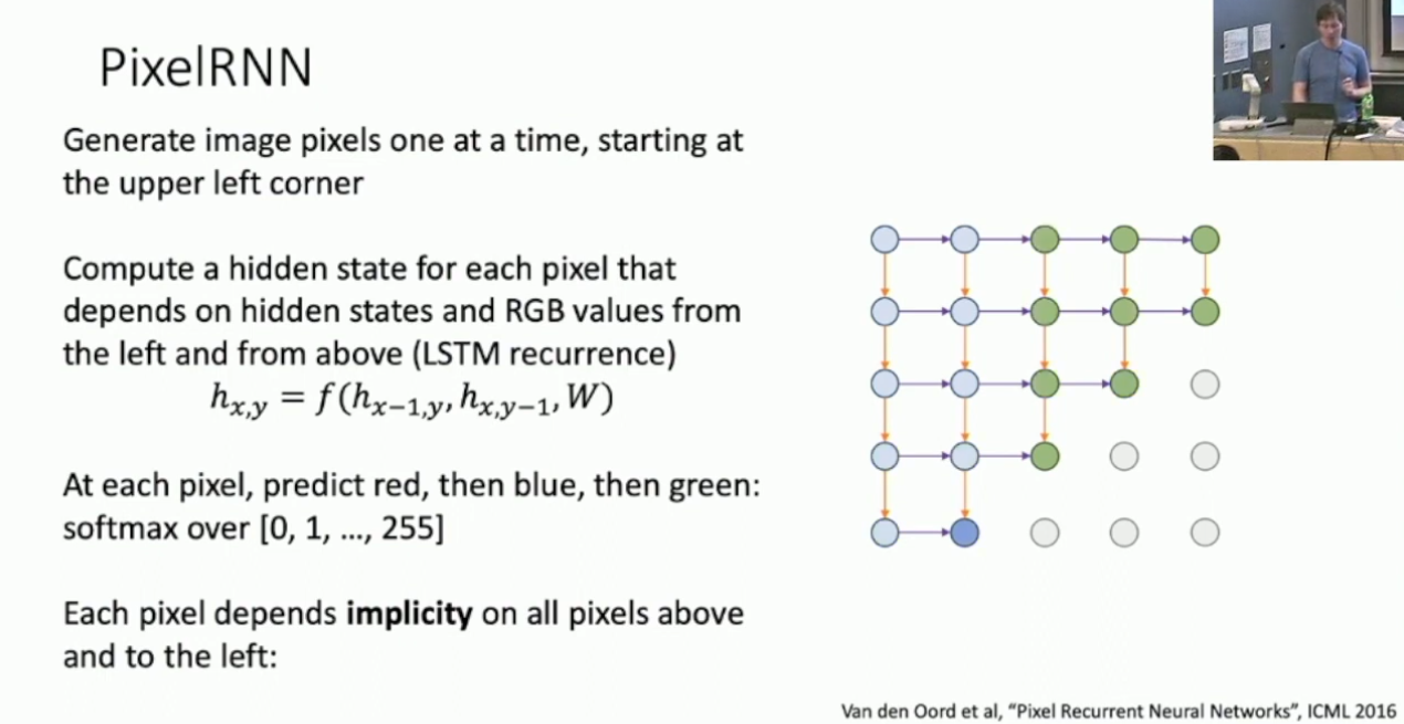 ,假定数据采样是独立的,那么该数据集的概率是: 假定 服从参数为 的分布,其概率密度函数为 ,我们希望最大化其似然: 对于 ,假定其有 个分量 ,则: 这就是说每一个 都只依赖于其前缀,所以我们考虑使用 RNN 来建模这个模型。3具体的,对于图像生成模型,我们考虑 Pixel RNN ,即对于位于 处的像素 ,有: 这样,按照上述方式建立 RNN 即可,而每一个像素依赖于其左上的所有像素。