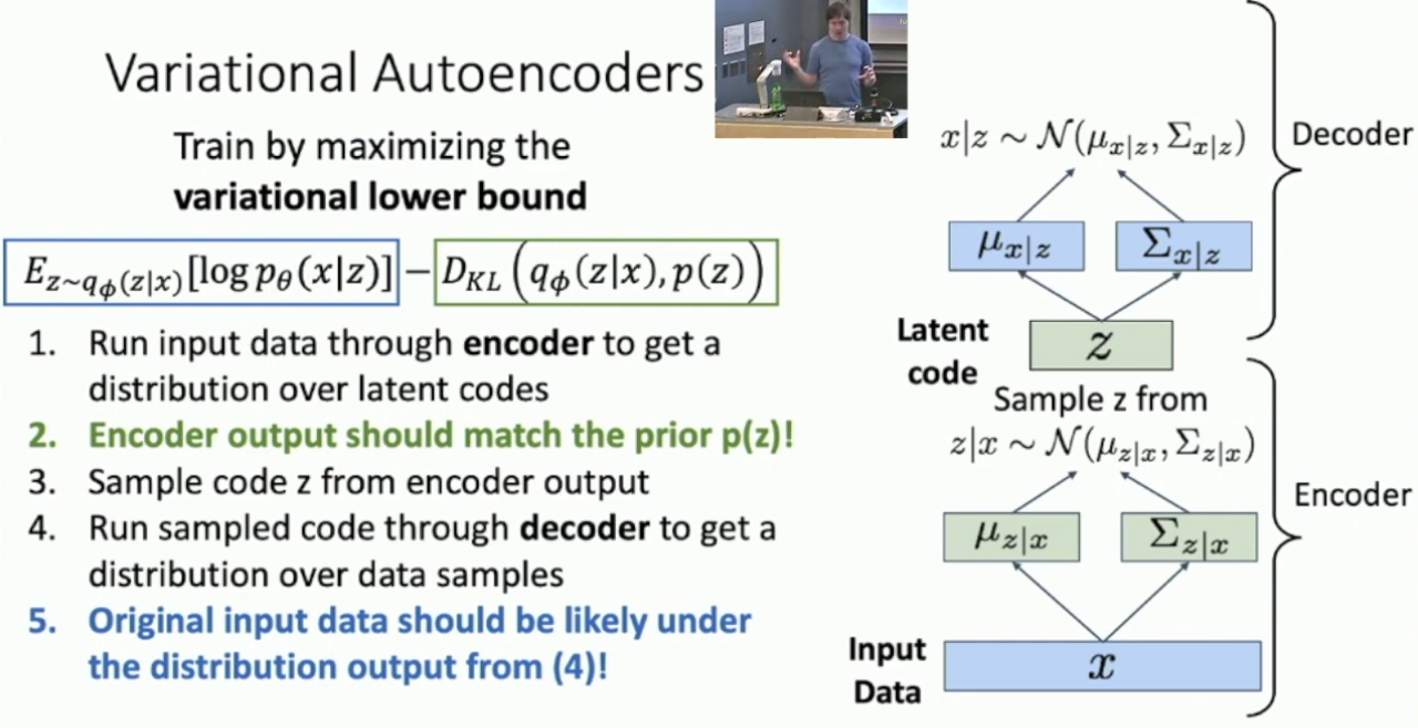 和 都分别服从独立高斯分布,之所以要求独立是因为协方差矩阵太大而无法处理。在训练时我们只能得到数据点而无法得到特征,所以我们考虑最大化数据点的似然: 我们希望建立数据点与特征的关系,考虑贝叶斯公式: 其中 是任取的。我们假设 服从一个简单的先验的分布,例如单位高斯分布,而 则由解码器预测。所以问题出在 上,这一项是没法算的。为此,我们考虑用另一个模型,称作编码器,来预测 ,从而得到另一个相似的概率密度函数 。你可能会想直接用 替换 来计算似然,但这样做太糙了。为了估计得更精细,现在我们要稍微推点式子: 注意到 与 无关,所以 。这样: 如果你有一点信息论基础,应该可以看出后两项形式上都是相对熵,因此都是非负的。对于最后一项,其包含了无法计算的 ,所以我们将其丢弃,就得到了: 我们无法直接优化似然,所以我们考虑按照上式优化似然的下界,这样就得到了如上的目标函数。而具体的训练过程则概括如下:
