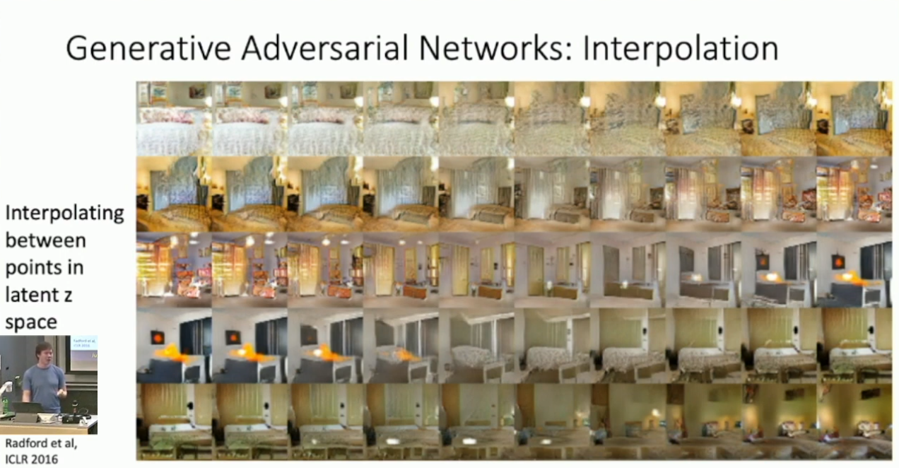 GAN 还有一些非常有趣的特性,其特征空间的结构其实是非常微妙的。举例来讲,如果我们从 GAN 的特征空间取样得到两个点,再对它们做插值11,那么其实可以看到插值点生成的图像的平滑变化。