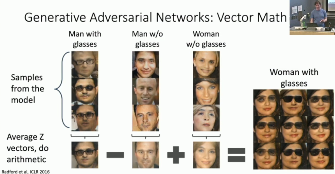 另外一个更厉害的特性是,我们甚至可以直接用特征做加减法。比方说,我们希望对具备“戴眼镜的男人”、“不带眼镜的男人”、“不戴眼镜的女人”这几个标签的特征采样,对每一类特征平均,再令第一类特征的均值减去第二类特征、加上第三类特征,从而得到具备标签“带眼镜的女人”的特征。这种事看上去很蠢,但令人震惊的是,我们其实真的可以这样期待。