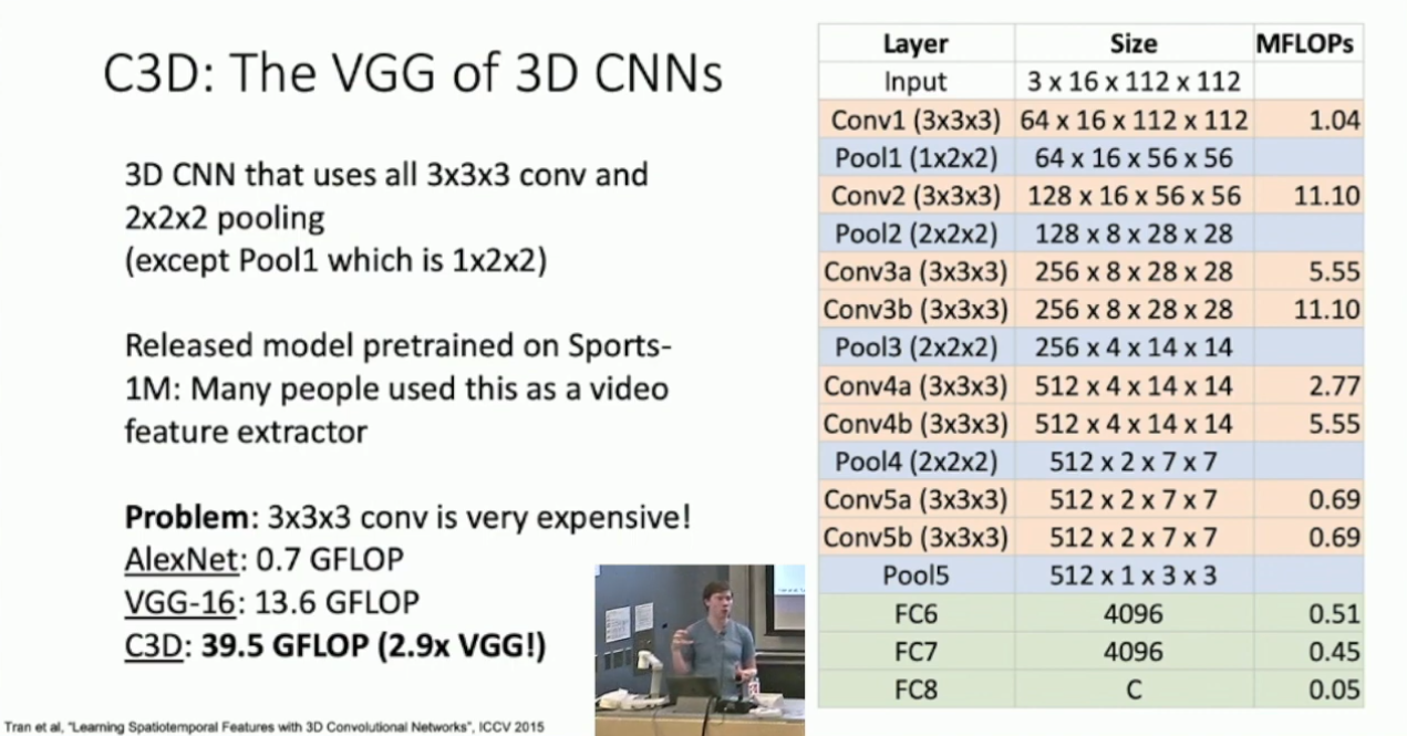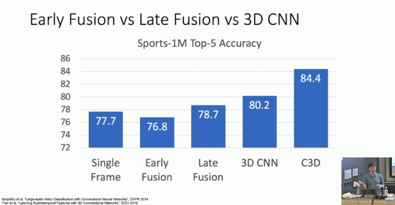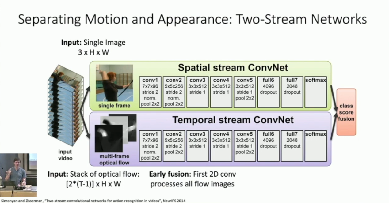 3D convolution 本身的计算开销也会更大。另外 Slow Fusion 也可以像 2D CNN 一样对 filter 做可视化。实际上 Justin 也提到可以对广泛的视频模型做可视化,通过梯度上升生成最符合单一分类指标的视频。但我觉得这比较平凡,就不谈了。↩︎
