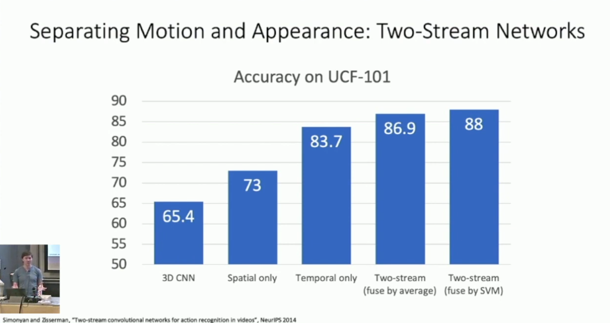简单的说,对于 stream 1 ,我们提取切片中的单帧进行 Image Classification ;对于 stream 2 ,我们对于每一帧计算其 Optical Flow(这应是一个 2 channel 的张量),再对其做 Early Fusion 。在训练时我们分别训练 steam 1 & 2 ,而在推理时我们对它们的预测结果做平均。我们可以期待这样做融合了视频的外观和动作,而其确实也取得了不错的结果:4