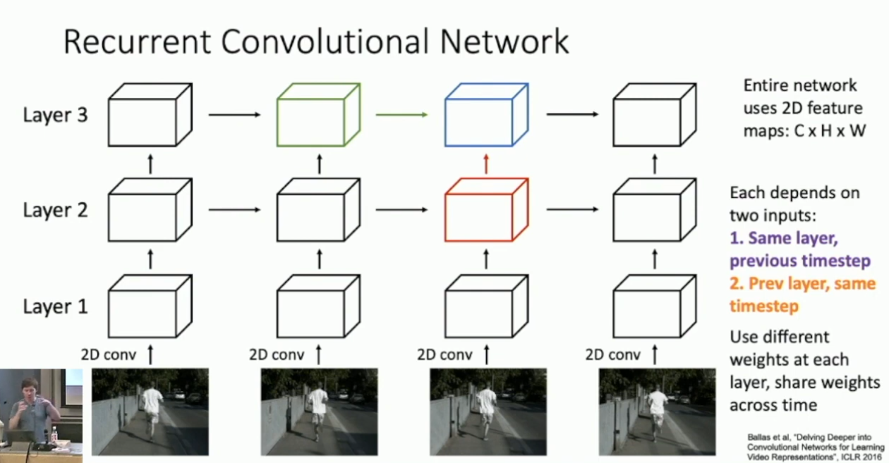 另外的一个观点是更深度的结合 CNN 和 RNN 。我们先前提到过 Multi-Layer RNN 这一技巧,在长视频处理中,我们考虑将 CNN 融入 Multi-Layer RNN ,称作 Recurrent Convolutional Network ,,大体结构如下: