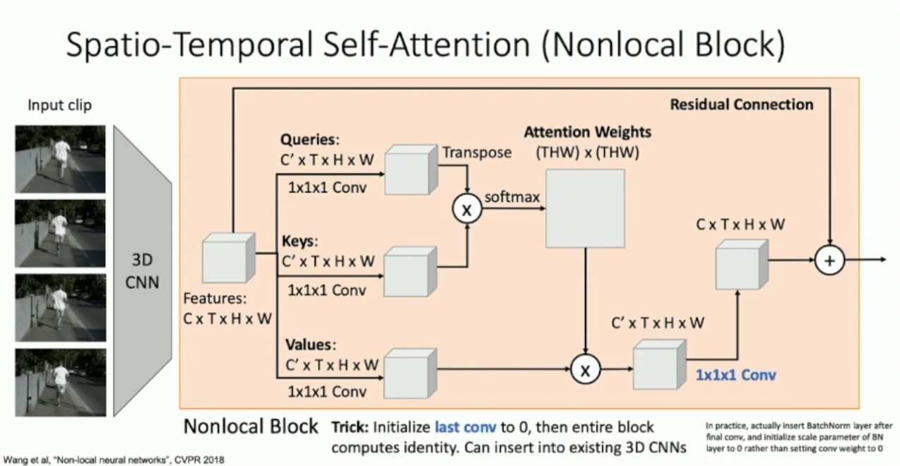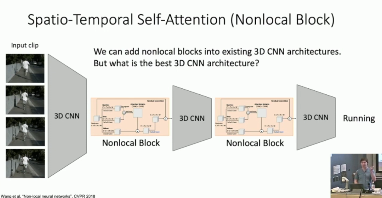 可以看出,Nonlocal block 同时做了时序上和帧内的 Self Attention 。将 Nonlocal Block 引入到 Slow Fusion 当中,我们就可以得到截止 2019 年的 SOTA 架构: