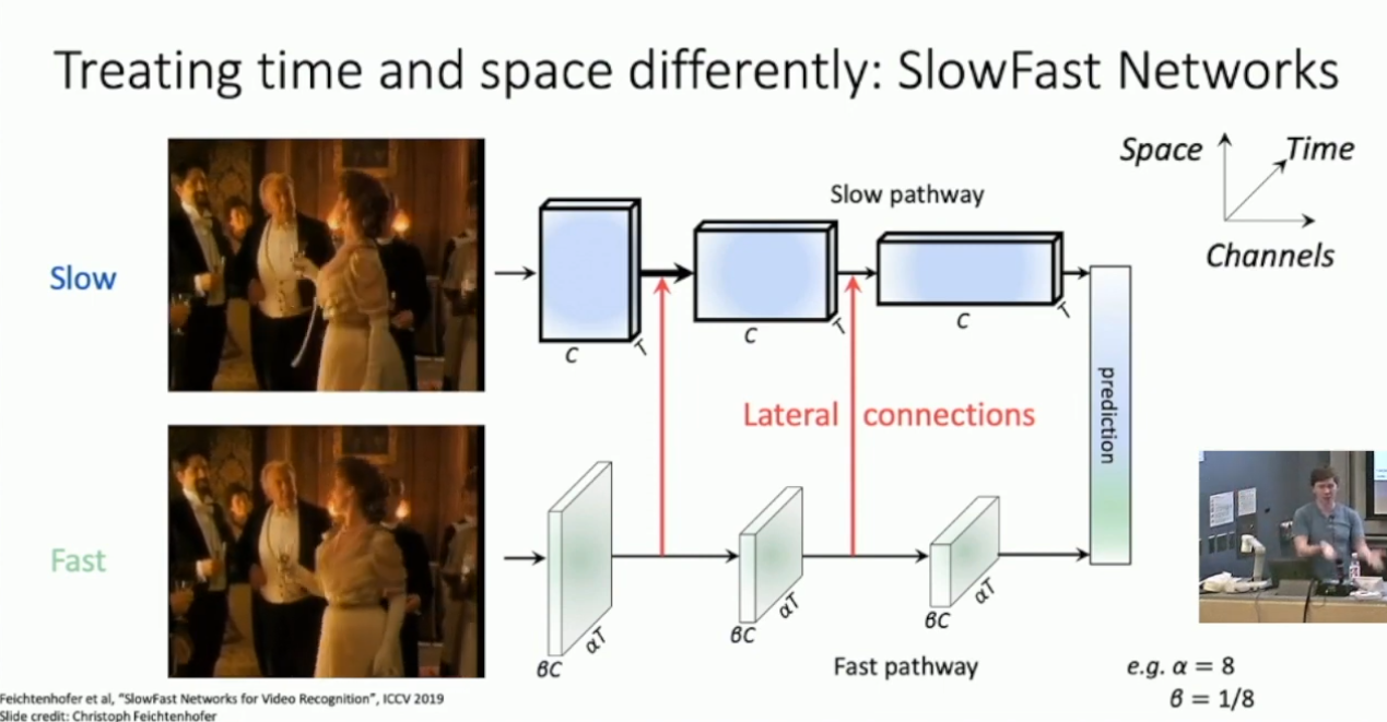 2-stream network 的缺陷是,其依赖于外部计算的 optical flow 。而 SlowFast Network 则改进了这一点,不同的是其并没有显式的拟合 optical flow ,而是令 stream 1 以高时间维处理低帧率的切片,stream 2 以低时间维处理高帧率的切片,并且加入 stream 2 到 stream 1 的横向信息传递,如下所示: