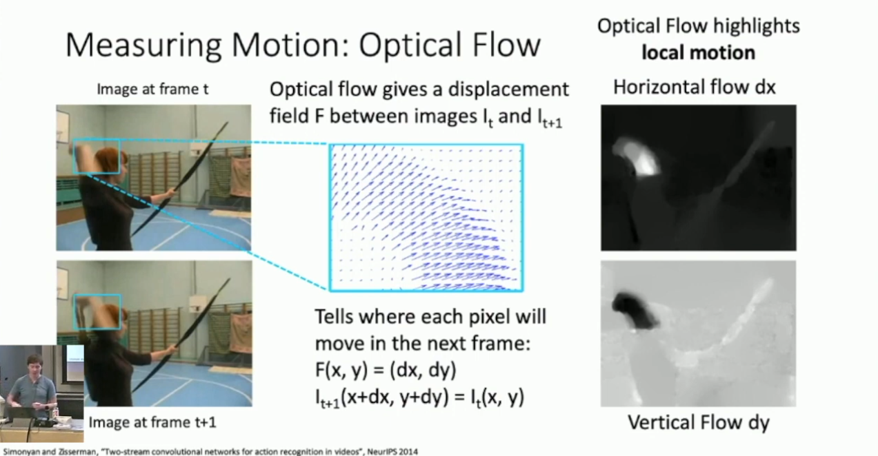 一个有趣的观点是人感知视频的一个重要方面是通过“动作”,我们希望将此概念同样引入到模型中,具体的方式则是 Optical Flow 。Optical Flow 描述的是像素在局部的帧间移动趋势,我们往往考虑垂直与水平两个方向:3
