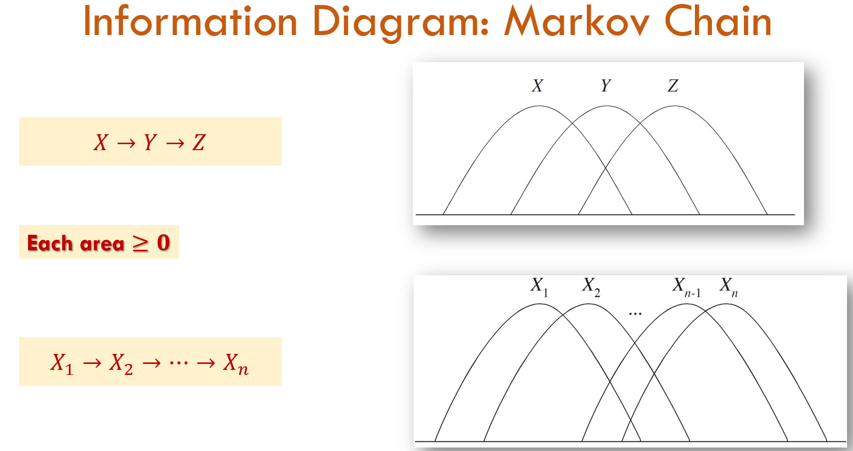 各部分的线性关系仍然符合一般的集合运算,但是中间的三变量互信息不一定是正的。而马尔可夫链的韦恩图就要简单很多,而且保证每个区域对应的量都是正数。(分布式加密的例子后来补上)