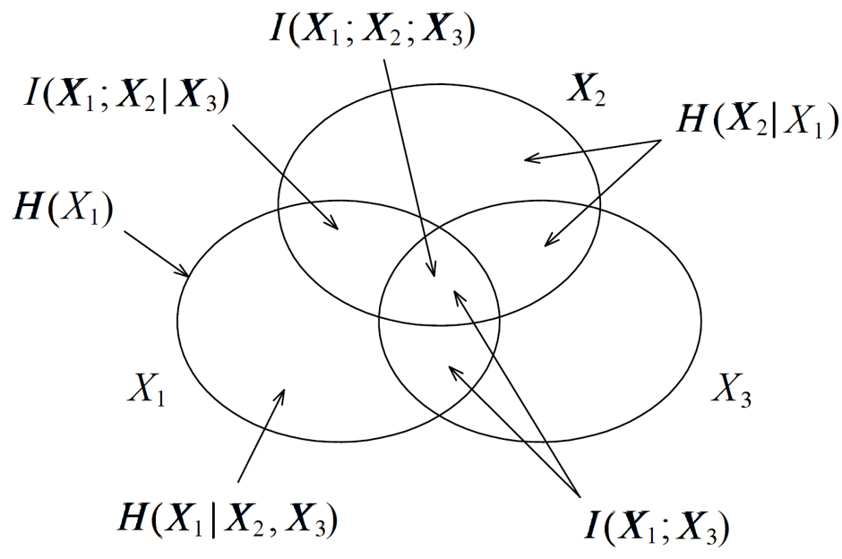 证明比较简单,对 用链式法则拆出马尔可夫链的形式即可。另外还有: 而在一般情况下上式是不一定成立的。1但我们还是定义: 这样可以画出三变量的韦恩图: