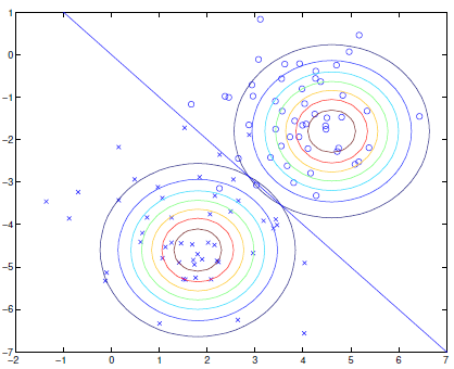 服从高斯分布。具备均值 与协方差矩阵 的高斯分布的概率密度函数为: 我们先承认这一点,因为我其实不熟悉协方差那一套。对于标准的二分类 GDA 模型,其假设为: 注意此处两个条件分布的协方差矩阵是相同的,这其实不是一个必须的假设,也有模型选择对两者做不同的参数化。这样做的好处是参数量更少,而且分类边界是超平面。考虑如何训练上述模型,我们仍然采用 MLE ,不同之处在于此处的优化目标是: 即联合分布,而此前的判别式模型的优化目标则是条件分布。这一方面是因为后者不对数据分布建模,另一方面也是因为其只需要做分类任务,而生成式模型学习到的东西则更为完整。那么,按照上式推导,容易得到在最小化联合分布的似然时有: 一个二分类 GDA 的分类边界示意图如下所示: