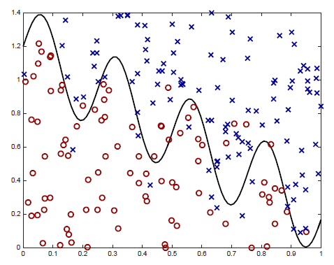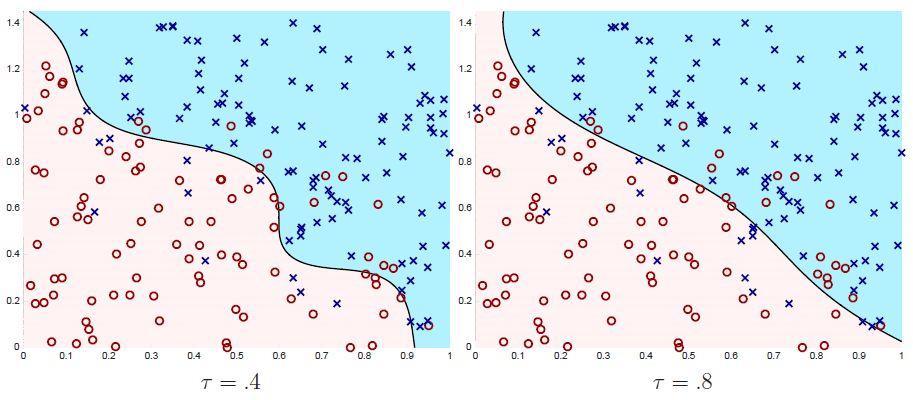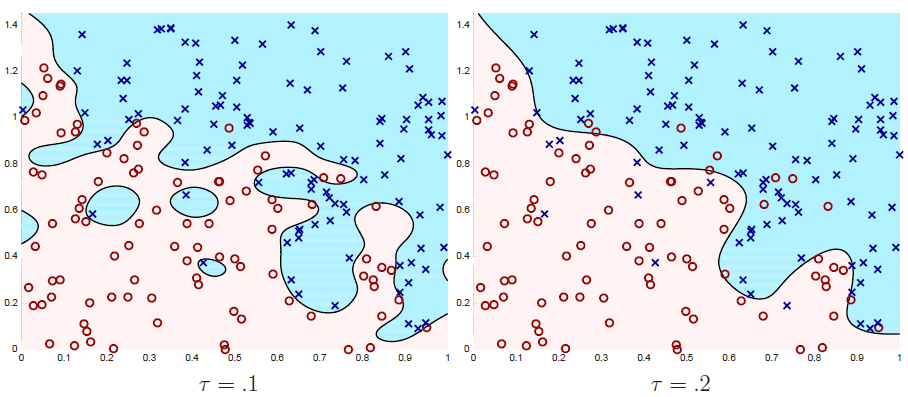 ,我们可以在不同的函数空间 中做优化。因此我们好奇在给定更复杂的核 时有什么意义。一个简单的看法是,我们将再生核 作为特征函数,将所有数据点映射到高维欧氏空间中,再做线性函数的 Soft SVM 。另一基于表示定理的观点则是通过更换核 ,也就更换了做 ERM 时选择的函数空间,此时 hinge loss 仍然以某种方式度量了数据点的分类正确性。一个常见的例子是选择高斯核: