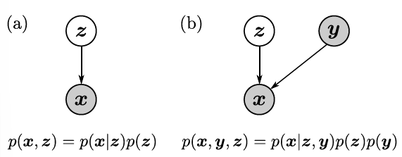 ,假定存在有向无环图 ,记 代表节点 在 中的全体前驱,则若: 称 刻画了一个概率图模型。概率图模型中的某些点在数据集中是不可见的,这些点便被称作隐变量。常见的模型,例如 EM 和 conditional VAE 的概率图模型形如: